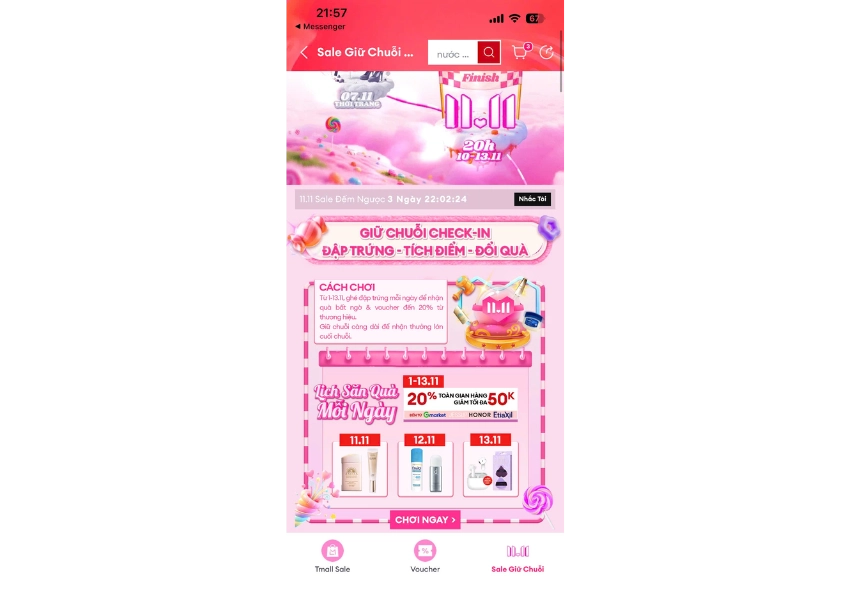 Từ ngày 1/11 đến ngày 13/11 các bạn có thể tham gia check-in đập trứng mỗi ngày để nhận quà bất ngờ cùng Voucher đến 20% từ thương hiệu. Việp đập trứng này giống như các bạn điểm danh nhận xu hàng ngày vậy. Rất đơn giản và dễ thực hiện. Đặc biệt nếu các bạn giữ chuỗi đập trứng càng dài thì sẽ có cơ hội nhận thưởng lớn cuối chuỗi nhé.