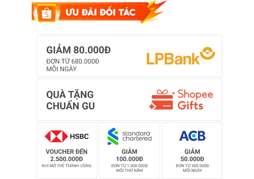 Ngoài các ưu đãi từ Shopee, các bạn còn có thể tiết kiệm hơn với những ưu đãi từ đối tác thanh toán của Shopee cũng rất hấp dẫn. Cụ thể: