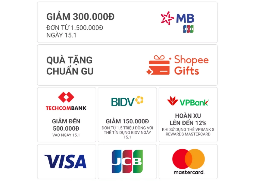 Ngoài các ưu đãi từ Shopee các bạn còn có thể áp dụng các Voucher từ đối tác thanh toán để giảm giá tối đa cho đơn hàng của mình nữa đó. Tham khảo ngay các ưu đãi thanh toán dưới đây nhé: