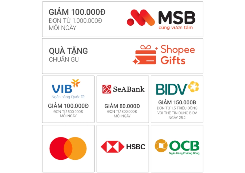 Ngoài các ưu đãi từ Shopee các bạn còn có thể áp dụng các Voucher từ đối tác thanh toán để giảm giá tối đa cho đơn hàng của mình nữa đó. Tham khảo ngay các ưu đãi thanh toán dưới đây nhé: